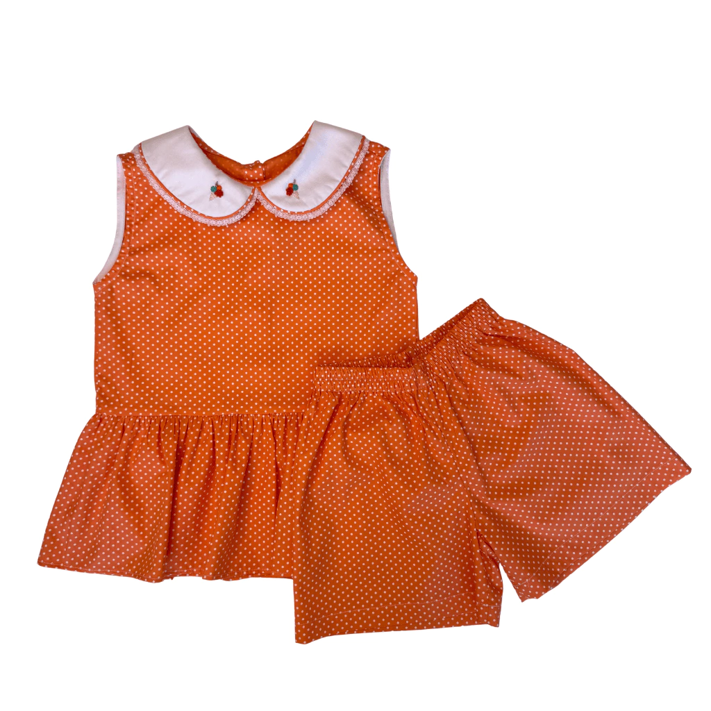 Descubra o Conjunto Sorvete, a super tendência que vai encantar o guarda-roupa dos pequenos! Com uma estampa exclusiva de laranja com poá branco, esta peça une charme e delicadeza em um design moderno e alegre.