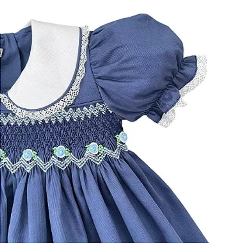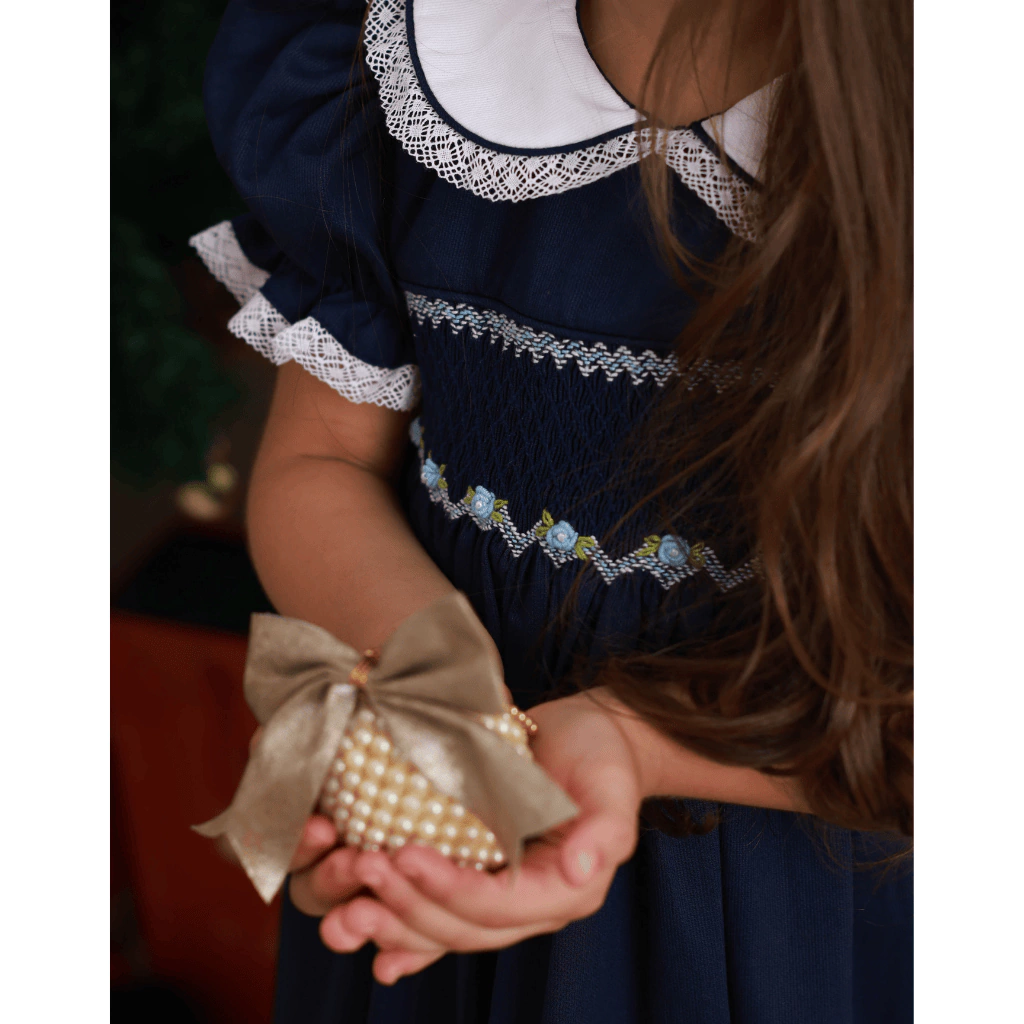 O Vestido Bebê Casinha de Abelha Anastacia - Azul Marinho da Little Closet é uma peça sofisticada e elegante para as pequenas princesas. Rico em detalhes, conta com uma palinha bordada à mão nas técnicas smock e rococos, golinha e manguinhas estruturadas, conferindo um charme refinado à criança. A saia em duas camadas, forro engomado 100% algodão e tecido premium natural 100% algodão tricoline fio 60 garantem um toque macio e confortável, enquanto o rodado estruturado mantém a delicadeza da peça.