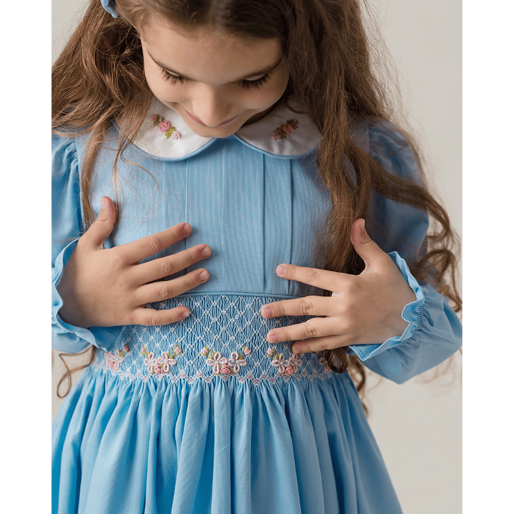 O Vestido Infantil Casinha de Abelha Rafaela é a expressão máxima de sofisticação e delicadeza, ideal para momentos especiais. Com pregas horizontais meticulosamente bordadas e um delicado ponto pérola na cintura, este modelo se destaca pela sua classe incomparável. O charme das técnicas de smock (casinha de abelha) e rococós adicionam um toque de beleza único, enquanto a gola branca bordada completa o visual com perfeição.