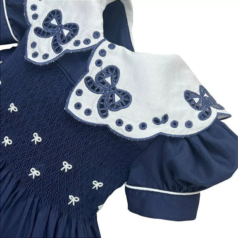 Destacando-se pela gola em Richelieu, com padrões intrincados que formam laços transmitindo delicadeza e refinamento, o vestido é confeccionado em tecido premium de puro algodão, proporcionando conforto e qualidade excepcionais.