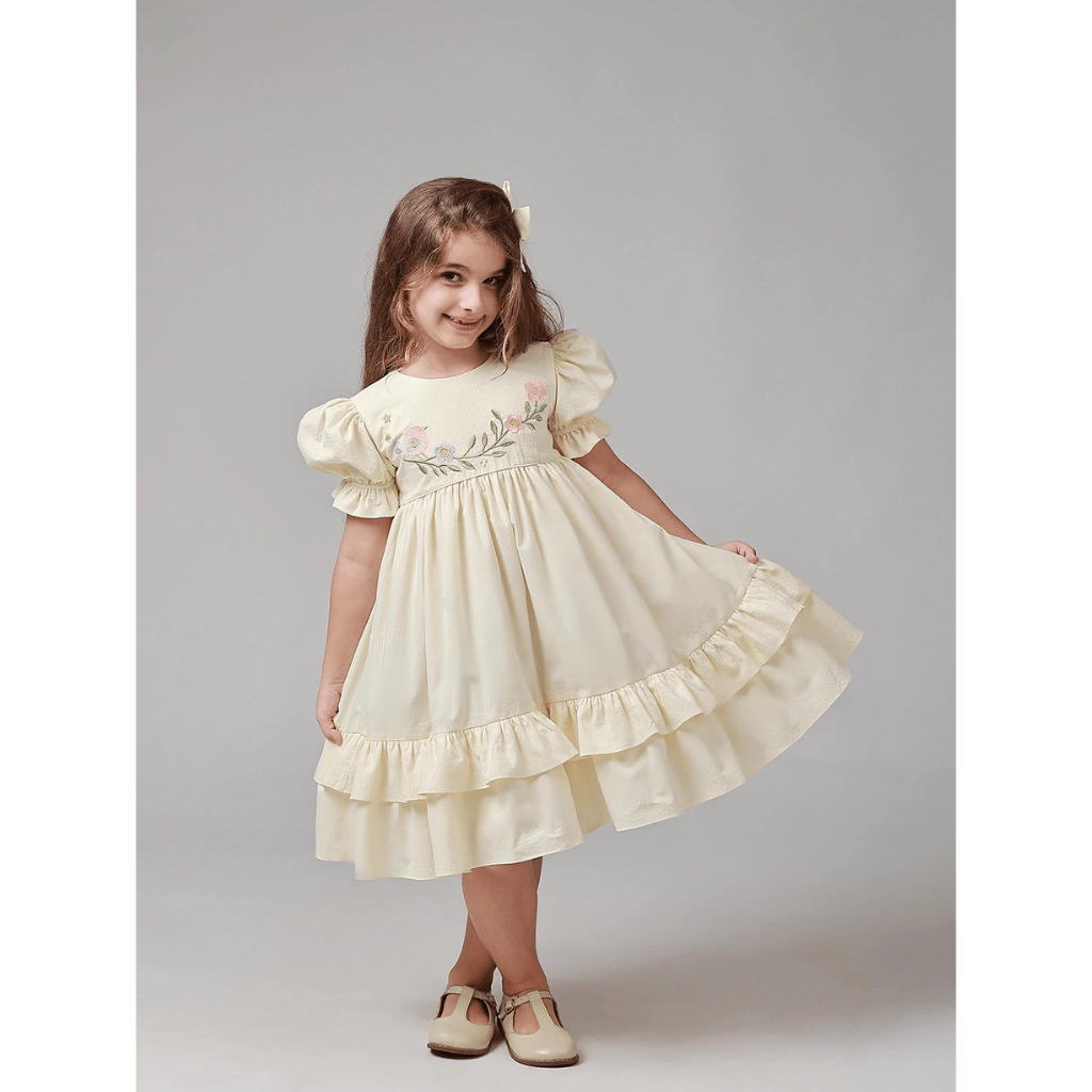 Características: Tecido anarruga texturizado, manga princesa bufante, bordado artesanal na pala, babados na saia